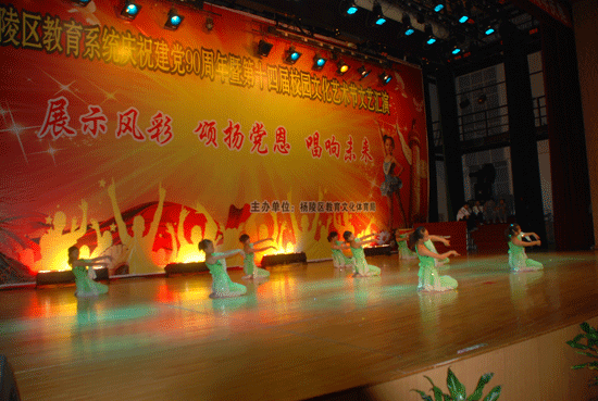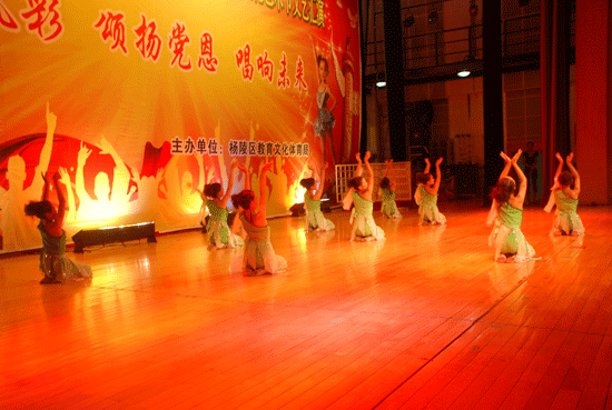 为隆重庆祝中国共产党成立 90 周年, 7 月 1 日下午 ,杨陵区教育文化体育局,在会展中心 3 楼演播大厅举办:“杨陵区教育系统庆祝建党 90 周年暨第十四届校园文化艺术节大型文艺汇演”活动,本次活动主题:“展示风采,颂扬党恩,唱响未来”。来自杨陵区各个学校的教师、学生表演了红歌联唱、爱国歌舞等节目,深情回顾了党的奋斗历史,热情讴歌党的光辉历程,充分展示了各个学校在辉煌九十载的历程中,艰苦创业,开拓创新,奋发有为的精神风貌。 |