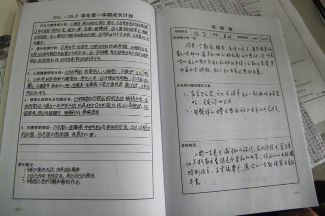 成长手册下发后,不管是导师、学生,还是家长,每个人都认真填写。学生们表达了自己的理想,也剖析了自己的问题;老师和家长也提出了自己的建议和对孩子的期望。在《手册》成长计划的“课外阅读计划”条目下,陈华老师的一位学生写道:“读好书,好读书,合理利用好班级的图书角;一书可多看,每次都会有不同的阅读体会;背诵好词、好句,并逐渐运用到作文中。”在“我需要的帮助”一栏里,他写道:“克服心理障碍,学会与他人有更多的交流;运动能力的加强;克服容易烦躁、焦虑的心理。”家长在“家长建议”里写道:“多参加体育活动,培养团队精神;主动与同学、老师交流,表达自己的想法;多看励志性的书和影视作品。”在“导师篇”里,陈华老师在“学生的问题和辅导方案”下为该同学写道:“在学习之余,可以培养自己的一两项爱好,充实你的生活;用榜样的力量带动班上更多的同学进步。”