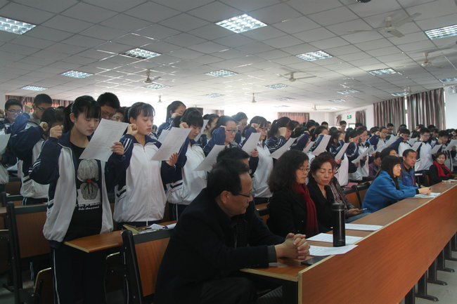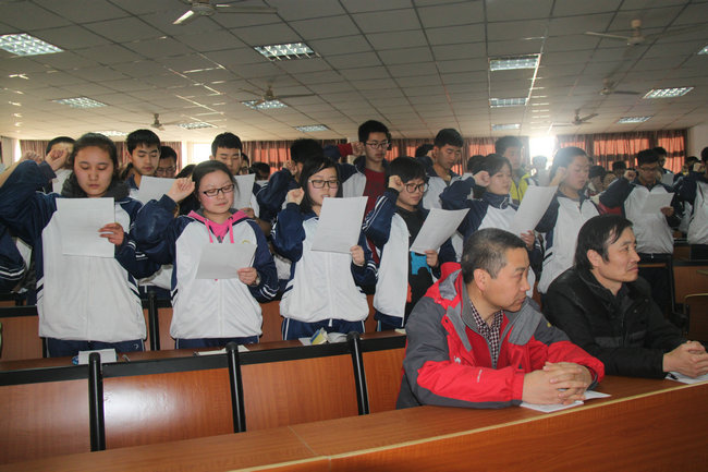 大会的第一项,在徐恒明副主任训誓后,学生代表聂宇翔带领所有高三学生宣誓。他们群情激昂、充满斗志,铿锵有力的誓言回荡在多功能厅,让在场所有人见证了他们的决心和信心。