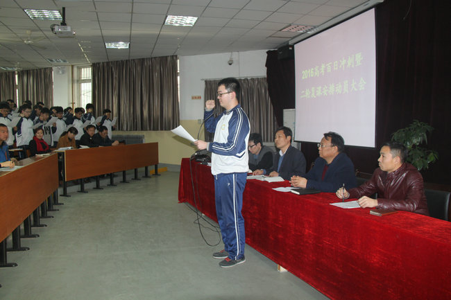 2月26日下午,伟德国际1946bv官网高三年级在多功能厅隆重举行了2016届高三百日誓师暨二轮复课安排动员大会。大会由高三年级组长张满户主持,韩党卫副校长、王旭主任、陈军主任、徐恒明副主任出席,全体高三教师与学生参加大会。