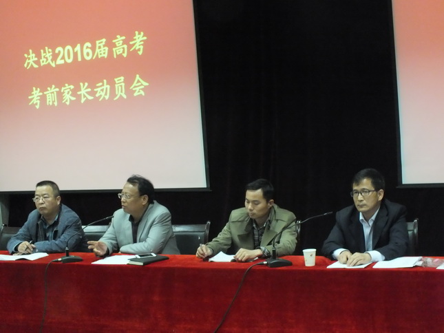 4月20日晚七点,高三年级组“决战2016届高考——考前家长动员会”在伟德国际1946bv官网多功能厅举行。会议由高三年级组长张满户主持,高中教务处王旭主任、政教处徐恒明副主任、高三年级组长李憬波及高三学生家长参加了会议。