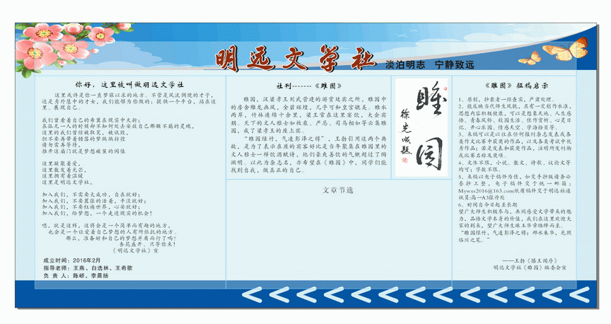 为了丰富学生的校园文化,激发写作兴趣,提高写作水平,引导学生快乐的阅读,尽情的展示学生的文学才华。在校团委的指导下,由语文组牵头,特成立学生自己的文学社团“明远文学社”--淡泊明志宁静致远,并创立社刊《睢园》--“睢园绿竹,气凌彭泽之樽”。