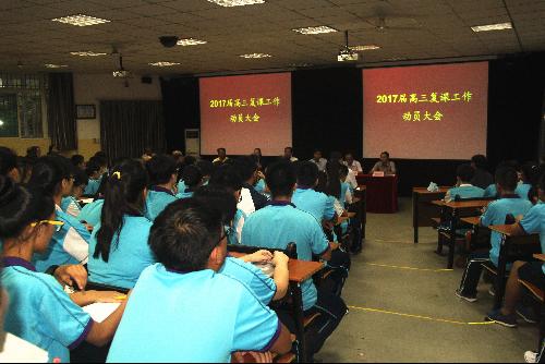 王旭主任向高三年级师生解读了复课计划,说明了2017年高考的目标,并对复课工作作了详细的安排,要求教师要按照规定的教学进度完成复课工作。徐恒明副主任对学生提出4点要求,即明确目标,坚持不懈,专注细节,懂得感恩。高三年级组长李恩良老师作了热情洋溢的动员讲话。他鼓励他们志存高远,科学备考,取得最后的胜利。教师代表翟西斌与学生代表分别作了表态发言,展示了教师和学生同舟共济、共同拼搏的决心。
