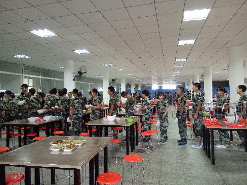 一日三餐是训练场之外的另一件大事。在训练结束后,所有同学在教官的组织下拿上自己的碗筷,于餐厅下集合队伍。每桌的值日同学提前到餐厅为同一桌的战友打好饭菜后,所有同学有秩序地进入餐厅就坐。在吃饭之前,大家要齐声背诵“谁知盘中餐,粒粒皆辛苦”的诗句,吃饭过程中不允许任何人说话,吃完饭值日同学需要收拾餐桌卫生,其他同学清洗自己的碗筷。整个就餐过程秩序井然,充分践行了就餐礼仪,这是对同学们无声的教育。