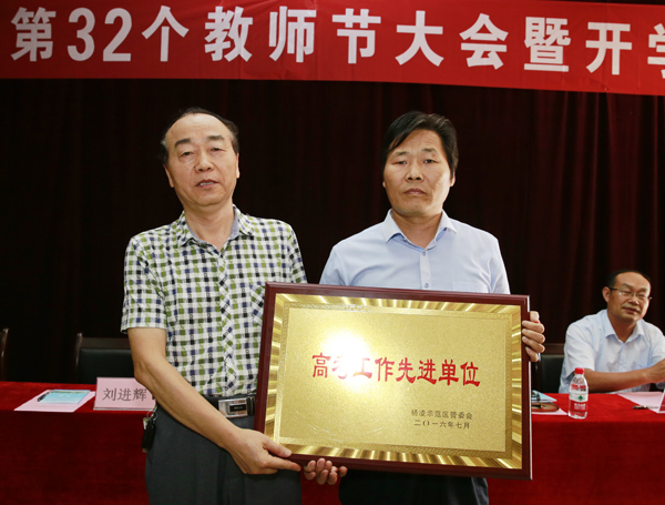 庆祝教师节大会暨开学典礼上,杨凌示范区向学校附中颁发了高考工作先进单位奖牌。